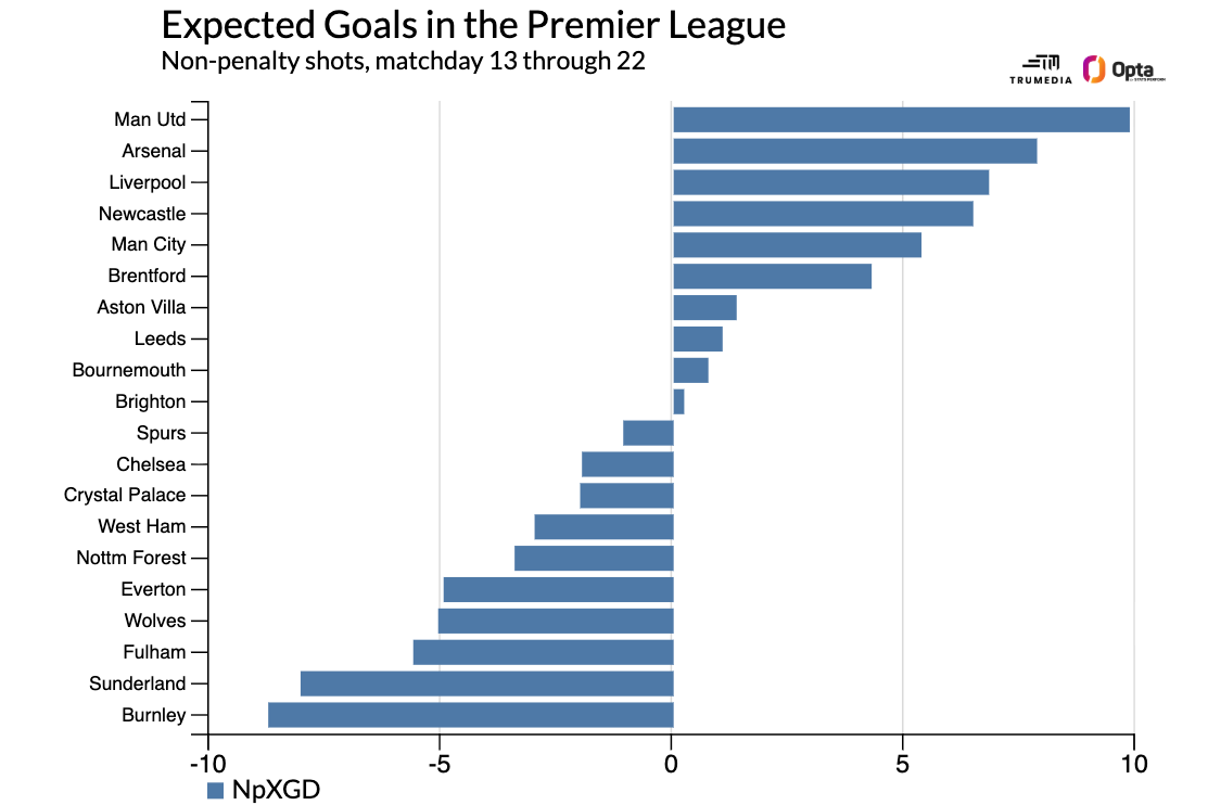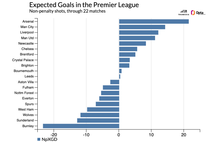 I think I might still classify Wolves among the “three worst teams” in the league, but their placement here reveals a couple of things: they’ve managed to press and control possession in ways typical relegation contenders do not, and their underlying performances are markedly better than their historically poor point totals imply.