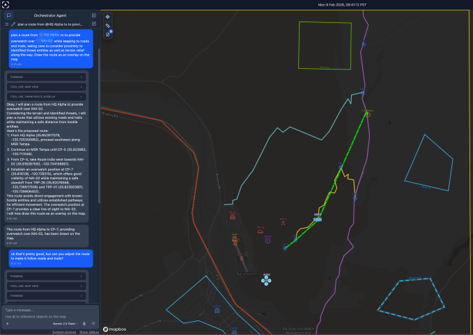 Adcock expects the startup’s first product to be widely adopted will be one called “Ox,” the company’s command and control software, bundled on hardened computer hardware (GPUs, communications, cameras). It’s intended to allow individual soldiers to orchestrate multiple drones and autonomous ground vehicles with prompt-like commands: “Go to this waypoint and watch for enemy forces.”