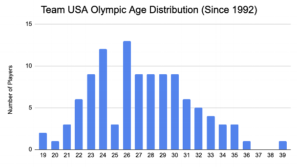 This distribution is atypical. Since the inclusion of NBA players in the 1992 Games, most Team USA athletes have been in their mid-to-late 20s, with only rare instances of significantly younger or older players.