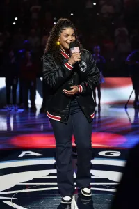 Image Credit: John Salangsang Jordin Sparks performs the National Anthem at the LA Clippers game on March 11.